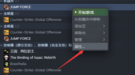 2.下载完成后,解压到桌面或者其他文件夹里,然后打开steam找到Jump大乱斗,右键单击游戏,然后转到“属性”。