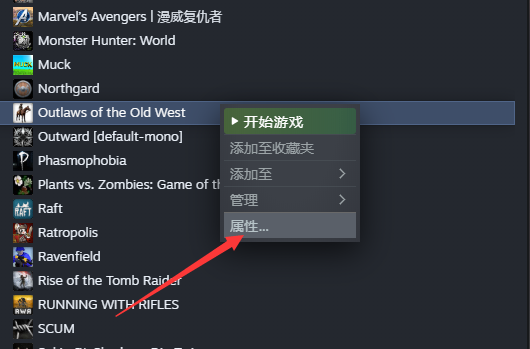 2.下载完成后,解压到桌面或者其他文件夹里,然后打开steam找到西部狂徒,右键单击游戏,然后转到“属性”。