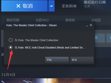 2.弹出下图窗口后,然后选择Play Halo:MCC Anti-Cheat Disabled,并点击开始