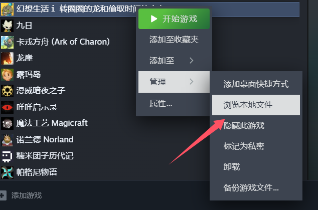 2. 下载完成后,解压到桌面或者其他文件夹里,然后打开幻想生活i 转圈圈的龙和偷取时间的少女,右键单击游戏,然后转到“管理”。再单击浏览本地文件,就能准确的找到游戏根目录