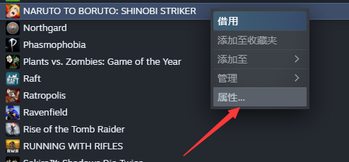 2.下载完成后,解压到桌面或者其他文件夹里,然后打开steam找到火影忍者博人传:忍者先锋,右键单击游戏,然后转到“属性”。